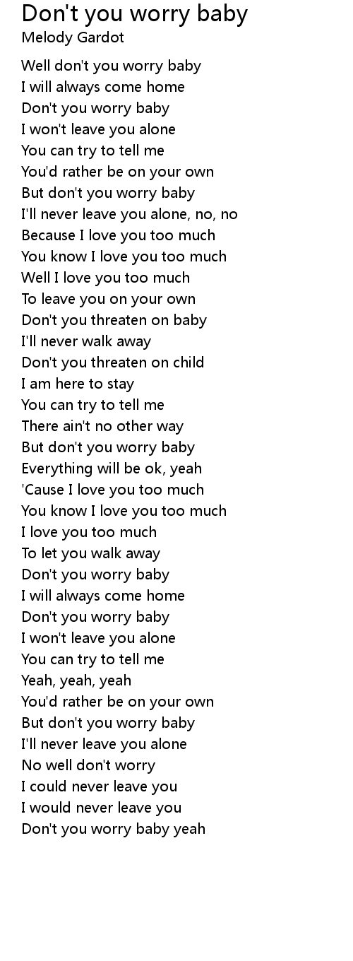 Dont you worry baby lyrics. And if you knew how much I loved you. Well dont you worry baby I will always come home Dont you worry baby I wont leave you alone You can try and tell me Youd rather be on your own Dont you worry baby I would never leave you alone Because I love you too much You know I love you too much Well I love you too much To leave you on your own Dont you fret on baby Ill never walk away Dont you fret on child I am here to stay You. Dont You Worry Child feat.