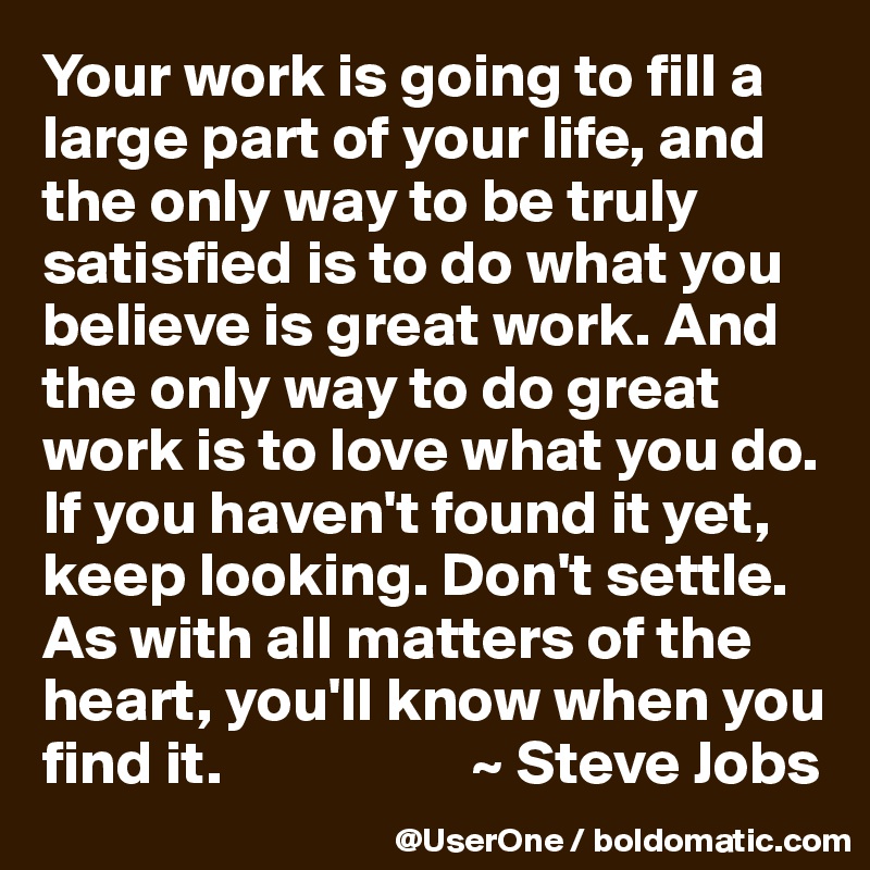 Dont settle - Steve Jobs. Your work is going to fill a large part of your life and the only way to be truly satisfied is to do what you believe is great work. Your work is going to fill a large part of your life and the only way to be truly satisfied is to do what you believe is great work.